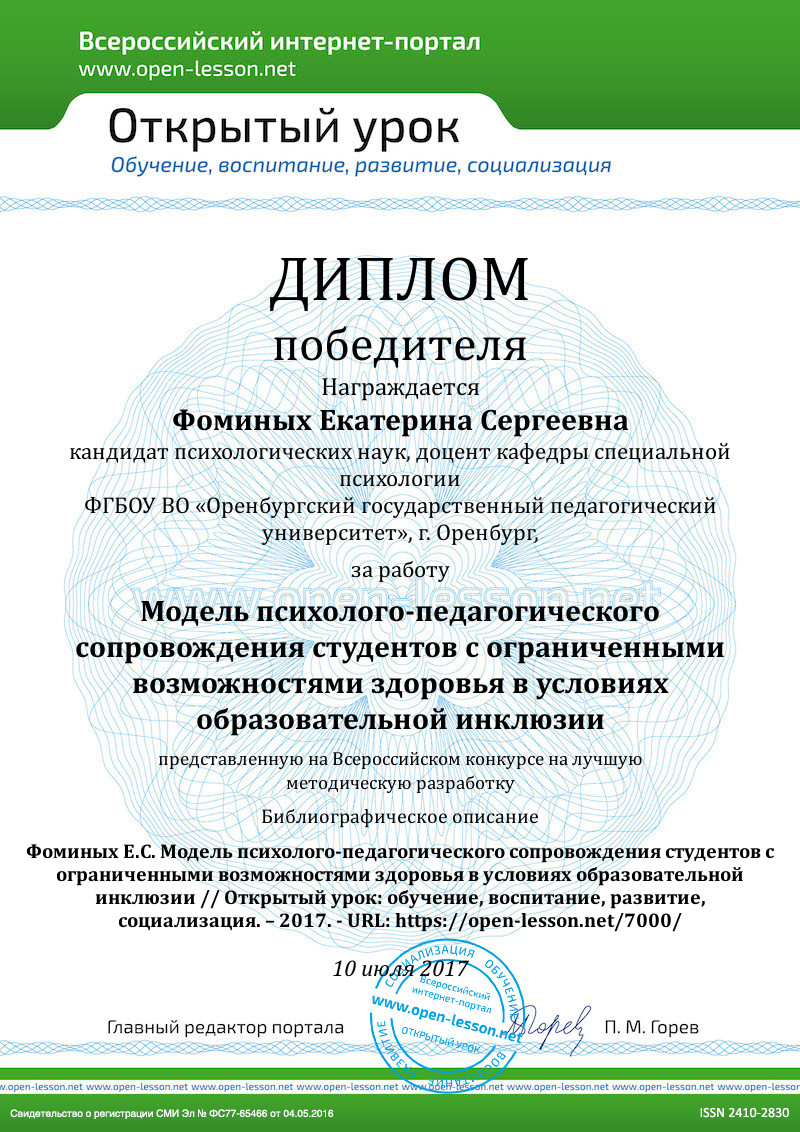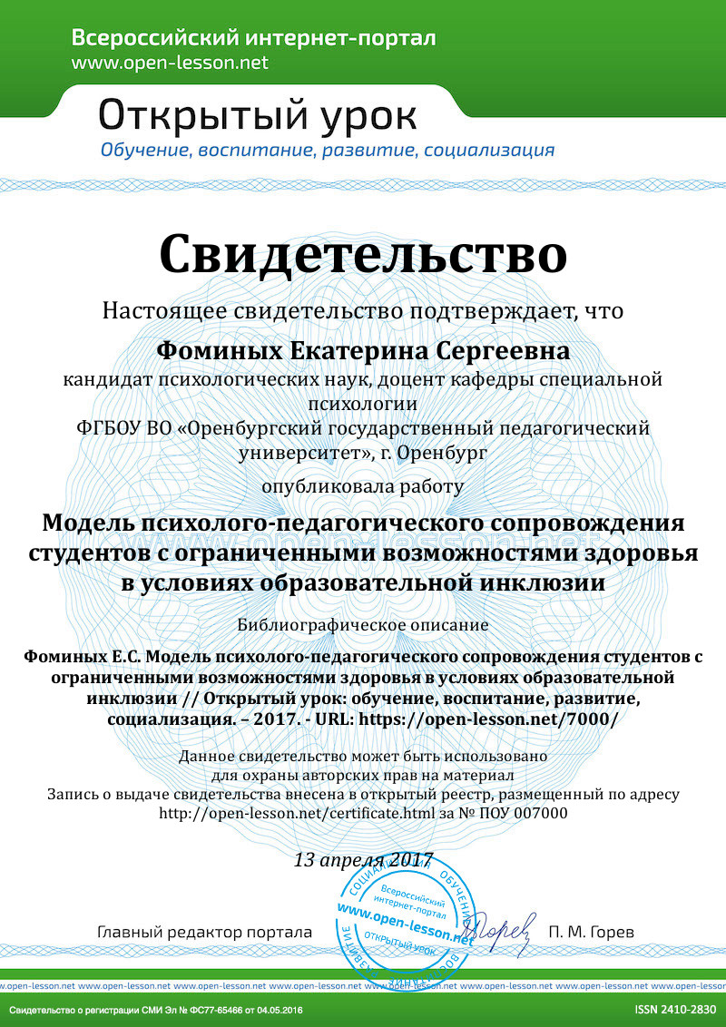 - Фоминых Е.С. Психолого-педагогическое сопровождение девиктимизации студентов с ограниченными возможностями здоровья в системе высшего профессионального образования // Перспективы науки. – 2013. – № 10. – С. 82-88.