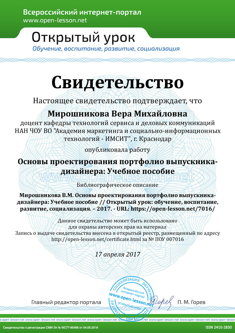Внедрение технологии разработки учебного портфолио у студентов направления подготовки 54.03.01 «Дизайн» имеет еще одну важную цель – демонстрацию профессиональных дизайнерских навыков, так как портфолио можно рассматривать как объект дизайн-проектирования, и с этой точки зрения, портфолио будет являться своеобразной визитной карточкой будущего дизайнера, его понимания и представления об эстетических установках и выражения собственных стилевых предпочтений.