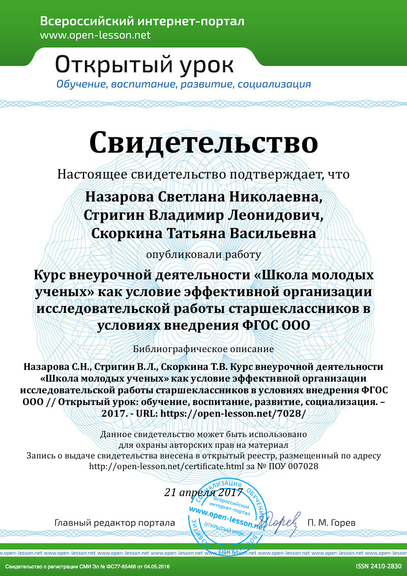 1. Назарова С.Н. Курс внеурочной деятельности «Школа молодых ученых» для обучающихся 8-11-х классов [Текст]: учебно-методическое пособие/С.Н.Назарова, В.Л.Стригин, Т.В.Скоркина, Е.И.Чураев.-Барнаул:Издательская группа «Си-пресс»,2015.–147с.–URL:http://sizif-izdat.ru/shop/group_595/item_238/