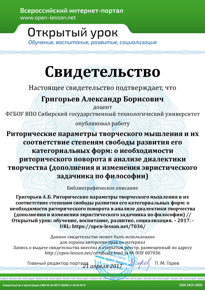 Явление «нераздельности неслиянных» мысли, слова и «живого действия» отмечал В. П. Зинченко, сделав вывод о том, что большинство тестов для «измерения интеллекта» грешат тем, что в лабораторных условиях пытаются измерить мысль так, как если бы она могла возникнуть отдельно от языка и непосредственно «живого», свободного действия не стеснённого человека, создающего нечто новое [1]. В этой связи мы, применив изобретательский приём введения дополнительного измерения, добавили к категориальной оси диалектических элементов первой общекультурной компетенции (вопрос – противоречие – решение – неразрешимость) не менее творческую вторую, риторическую: ирония – метонимия – метафора – синекдоха – перифраза – гипербола-мейосис – эмфаза, назначив весь её только что перечисленный состав для исполнения функции динамически устойчивых параметров всё более усиливающего себя неравновесного процесса творческого мышления.
