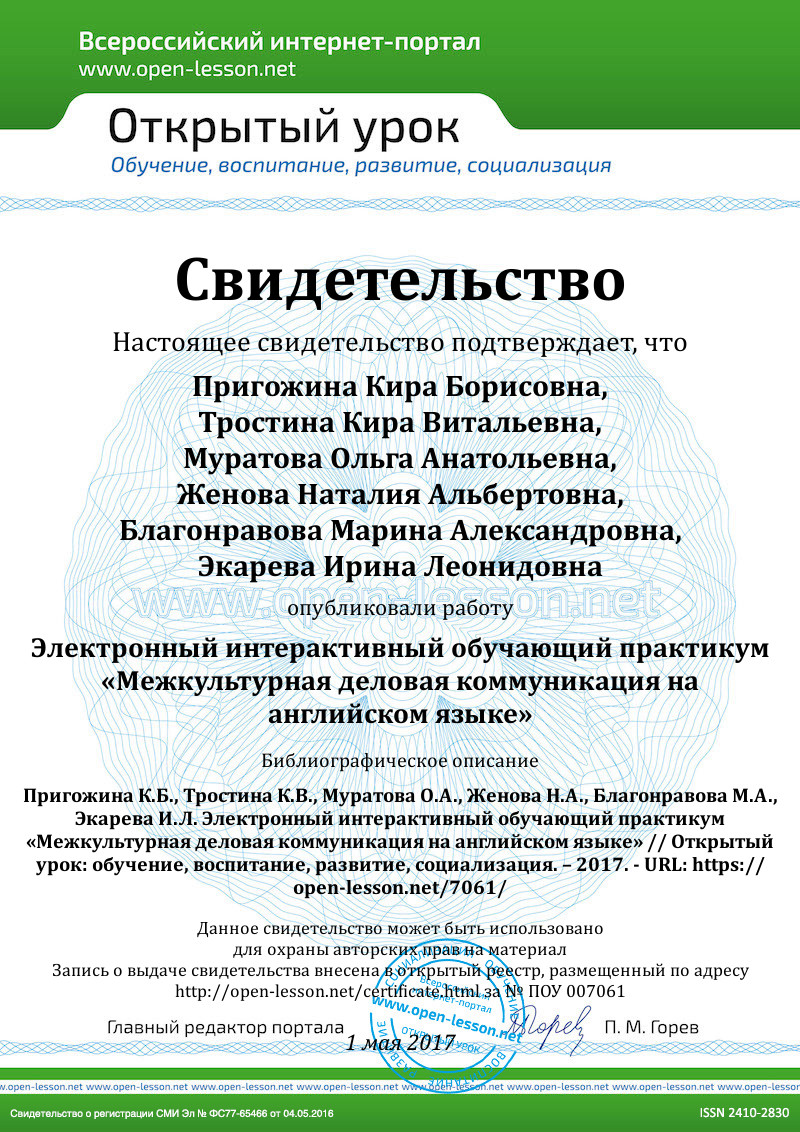 Благонравова М.А., Женова Н.А., Муратова О.А., Пригожина К.Б., Тростина К.В., Экарева И.Л. Электронный интерактивный обучающий практикум "Межкультурная деловая коммуникация на английском языке: проектная работа" для студентов направления 38.03.01 «Экономика». 2016. №11 (90). С.11-12. – Объединенный фонд электронных ресурсов «Наука и образование»» Министерства образования и науки РФ. Свидетельство №22261 от 22.11.2016 выдано ФГБНУ ИУО РАО ОФЭРНиО. Хроники объединенного фонда электронных ресурсов. Наука и образование.