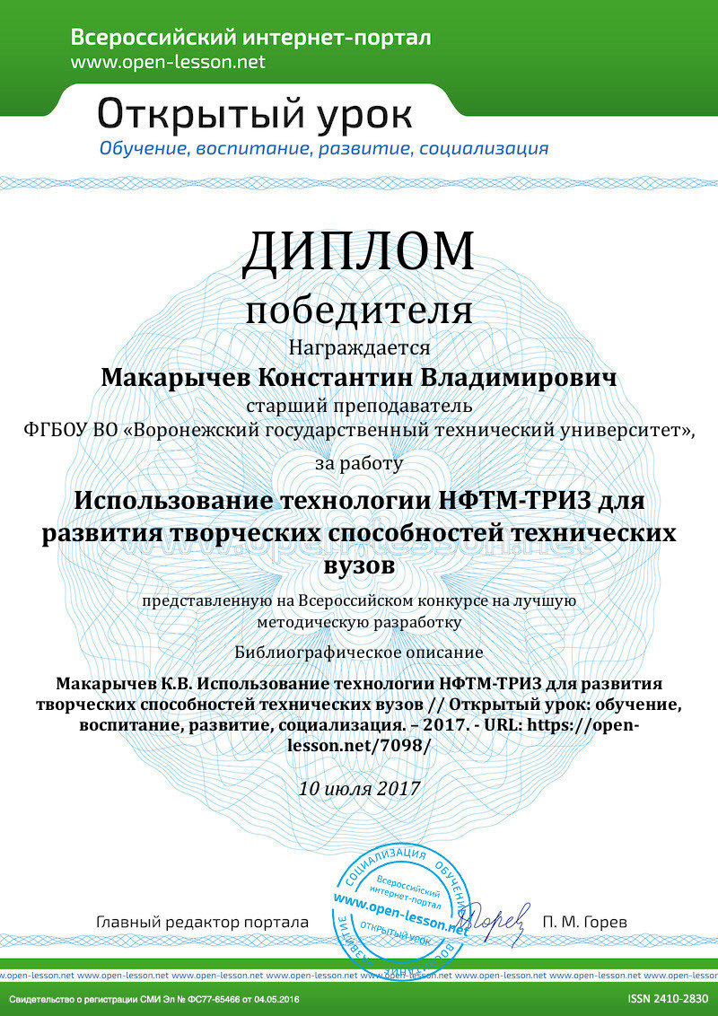 11. Григорова Л.В. Интерактивные формы и методы обучения студентов на уроках инженерной графики по системе НФТМ-ТРИЗ. // Всероссийский интернет-портал «Открытый урок: обучение, воспитание, развитие, социализация» - https://open-lesson.net/898/ - Дата обращения 24.04.2017.