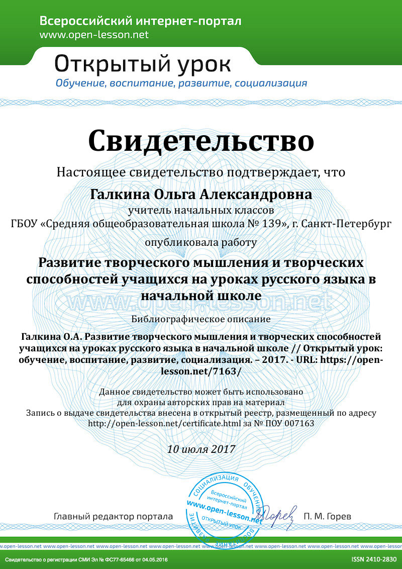 Курс русского языка в начальной школе – часть единого непрерывного курса обучения, поэтому он ориентирован на предмет и цели обучения русскому языку в основной школе. Предметом обучения является современный русский литературный язык в его реальном функционировании. Цель обучения – развитие и совершенствование всех видов речевой деятельности: чтения, письма, слушания, говорения; формирование элементарной лингвистической компетенции. Исходя из этого, назначение предмета «Русский язык» в начальной школе состоит в том, чтобы заложить основу формирования функционально грамотной личности, обеспечить языковое и речевое развитие ребенка, помочь ему осознать себя носителем языка [3]. Но как показывает практика, дети испытывают серьёзные затруднения в восприятии учебного материала, а занятия русским языком определенному количеству школьников неинтересны. Поэтому задача учителя состоит в том, чтобы вовлечь учащихся в процесс познания русского языка. А создание атмосферы творчества на уроках способствует положительной мотивации процесса обучения, так как именно в творчестве, находится источник самореализации и саморазвития личности, умеющей анализировать возникающие проблемы, находить их оптимальное решение.