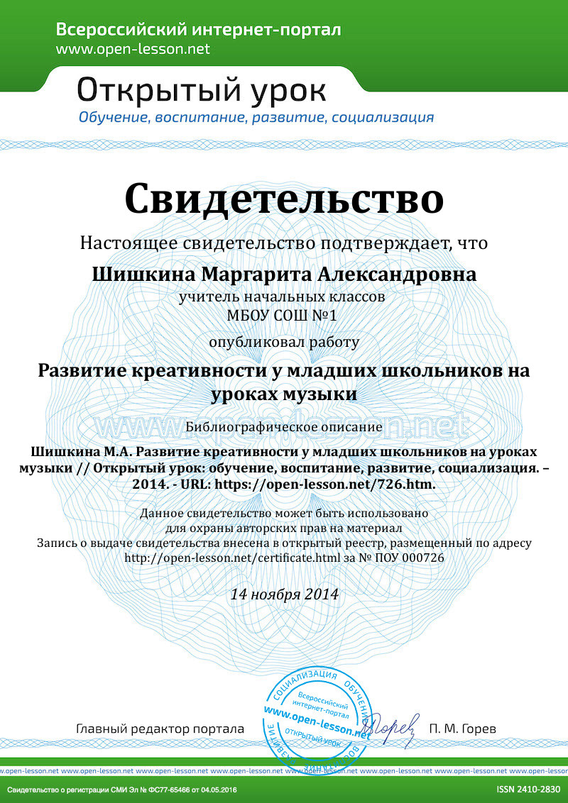Сегодня, в век высоких технологий, инноваций и модернизаций, мы все чаще и чаще хотим видеть и замечаем вокруг себя лишь яркие краски жизни. Примеряем на себя все новое, тянемся к тем, кто выделяется из толпы, и резюмируем: «Да, это творческая личность, креативная» –подчеркиваем вдохновенно. А, что же такое творчество и креативность? И как выделиться из толпы или как раскрасить толпу яркими красками. Ведь, «иногда творчество означает просто ежедневную работу в виде помощи другим людям видеть проблему по-другому». Джозефф Бадаракко.Возникает объективный вопрос, а когда и на каком возрастном этап, лучше всего развивать в человеке творчество, креативность. И именно здесь стоит обратить внимание на новое, но столь актуальное понятие в образовании «креативная педагогика, или педагогика креативного образования». По результатам исследований Р. Альберта, К. Бери, С.Д. Бирюкова, Д.Б. Богоявленской, Дж. Гилфорда, Н.М. Гратко, Е.Л. Григоренко, В.Д. Дружинина, Л. Калберга, Е.А. Корсунского, Б. И. Кочубея, Д. Манфилда, А. М. Матюшкина, М. Рунко, Д. Саймонтона, Е.В. Субботского, Э. П. Торренса, В. И. Тютюнника, Н.В. Хазратовой, Д.Б. Эльконина и др. позволяет выделить основные стадии становления креативной личности: потенциальную, первичную, общую и специализированную. Исходя из этих данных, следует, что креативность додеятельностная, характеризует врожденные предпосылки креативности индивида с точки зрения его готовности к приобретению актуальной креативности. Далее следует общая способность к творчеству, развивающаяся у детей до 6-7 лет. А уже далее следует «специализированная креативность», – способность к творчеству в определенной сфере человеческой деятельности и развивается на основе общей креативности под влиянием опыта профессионально – творческой деятельности. Креативность является одним из важнейших психологических образований, обуславливающих успешность человека в самых разных областях деятельности человека. Развитие креативности – одна из приоритетных задач современного образования. Комплексный подход к воспитанию творческой личности охватывает широкий круг вопросов, относящихся к проблемам обще-эстетического и нравственного воспитания. Неразрывное единство идейно – мировоззренческого, духовного и художественного является неотъемлемым условием личности подрастающего человека, разносторонности и гармоничности ее развития. Ценность творчества, его функции, заключается не только в результативной стороне, но и в самом процессе творчества. Все это в полной мере можно отнести и к музыкальному искусству и школьным урокам музыки. Именно уроки музыки могут способствовать развитию креативности у учащихся младших классов. Под развитием креативности на уроках музыки мы понимаем развитие творческих умений в восприятии (слушательской деятельности), сочинении, исполнении, импровизации, размышлении о музыке. Возвращаясь к стадиям становления креативности личности, вспомним, что именно младший школьный возраст 6-7 лет, является сенситивным для развития креативности. Именно в этом возрастном периоде закладывается благоприятное основание для развития личности в целом, ее самораскрытия, самосовершенствования, самореализации, гибкой адаптации к постоянно меняющимся условиям жизни современного мира, самодостаточности и толерантнос