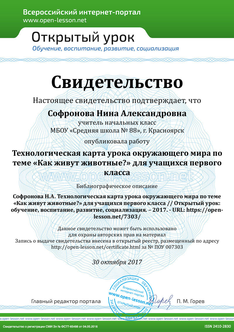 Ресурсы для проведения урока: А. А. Плешаков. Мир вокруг нас. (учебник для учащихся 1 класса), ¼ часть альбомного листа, лист А-4 с рисунками, повторяющими изображения в учебнике на стр. 72–73 (на каждого учащегося), ножницы, цветные карандаши, таблица с изображением кабана и свиньи с поросятами, тюлень и белек, корзина, нарисованная на ватмане, рисунок желудя.