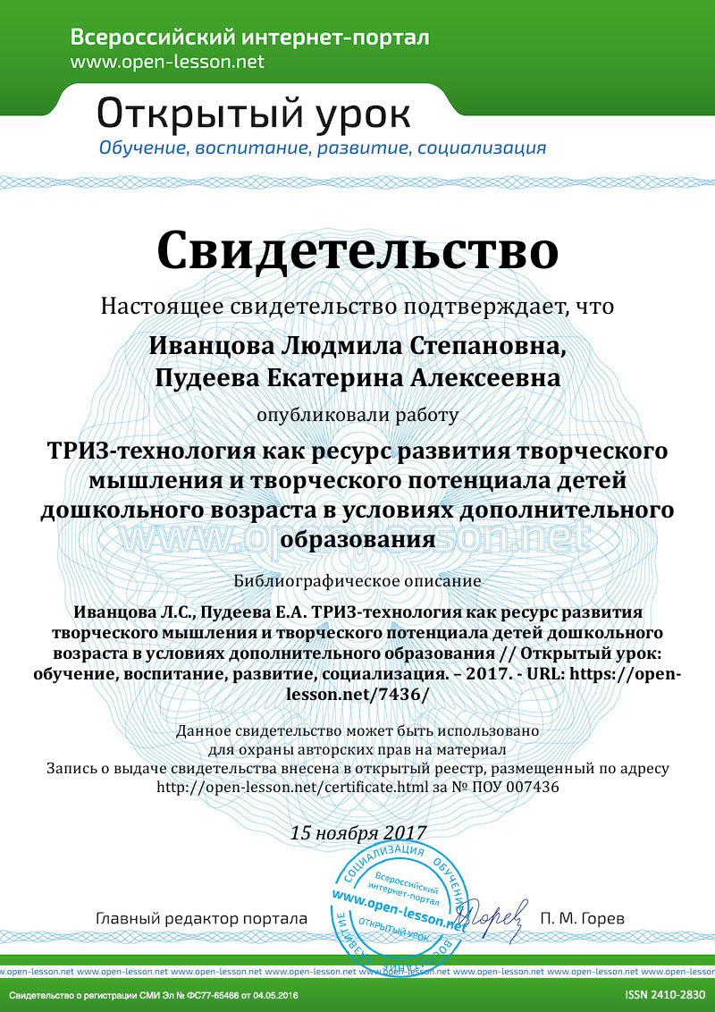 ТРИЗ-технология в работе с дошкольниками позволяет развить наглядно-образное, эвристическое мышление, память, воображение детей, обеспечивает прочное усвоение и систематизацию знаний за счет устойчивого интереса к системе творческих заданий, стимулирует ситуацию успеха, поддерживая веру у детей в свои силы и возможности, развивает партнерские отношения, основанные на взаимоуважении, сотрудничестве и сотворчестве.