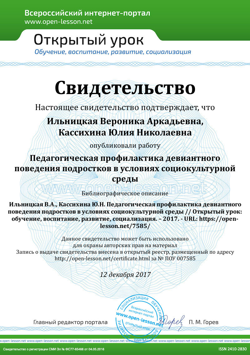 Ильницкая В.А. Девиантное поведение подростков: понятие, признаки, особенности // Вестник социально-гуманитарного образования и науки. – Екатеринбург. – 2013, № 2 (в печати).