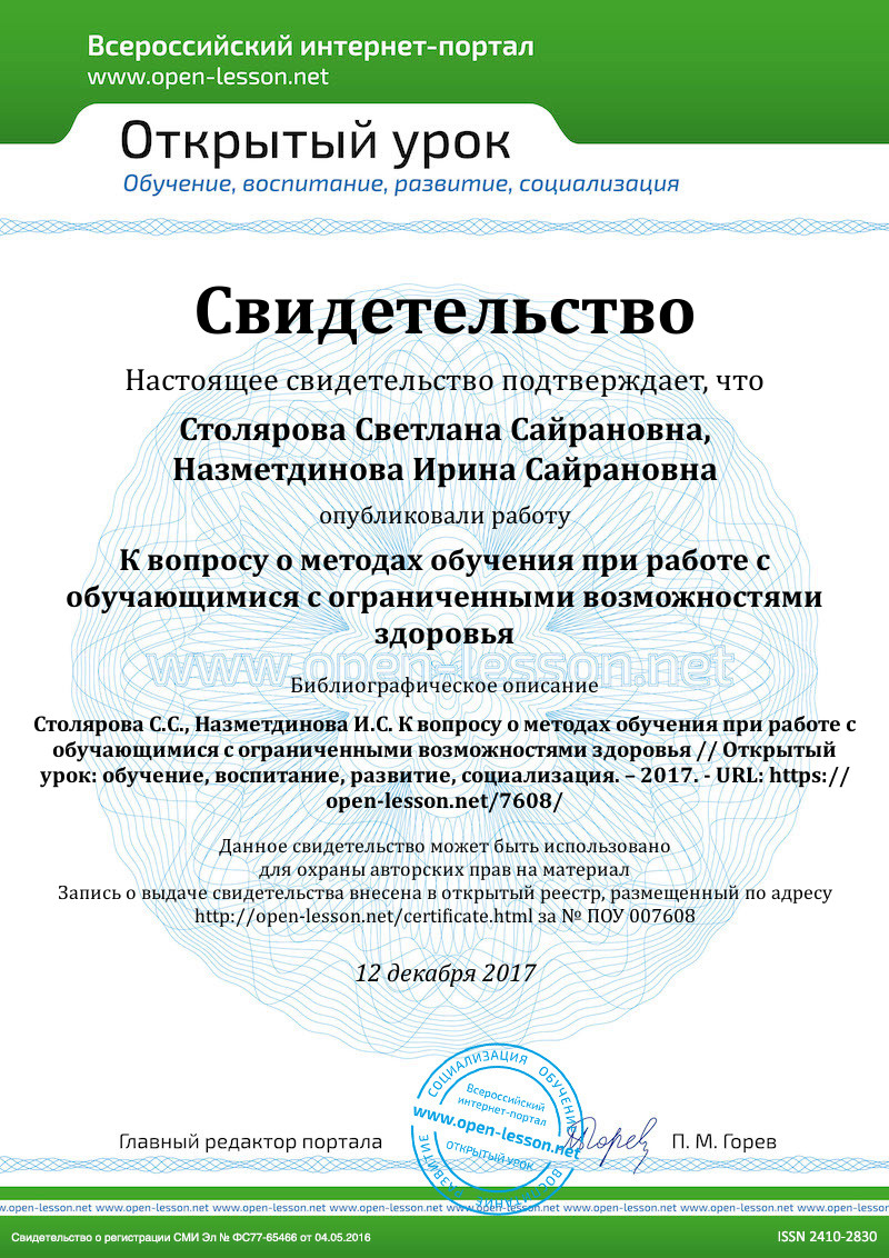 Назметдинова И.С., Столярова С.С. Выбор методов обучения при работе со студентами с нарушением ОДС Сборник публикаций научного журнала ''Globus'' по материалам XIV международной научно-практической конференции: «Психология и педагогика: актуальные вопросы» г. Санкт-Петербург - 21 ноября 2016: сборник со статьями (уровень стандарта, академический уровень). - С-П.: Научный журнал ''Globus'', Выпуск 10 (14) 2016.