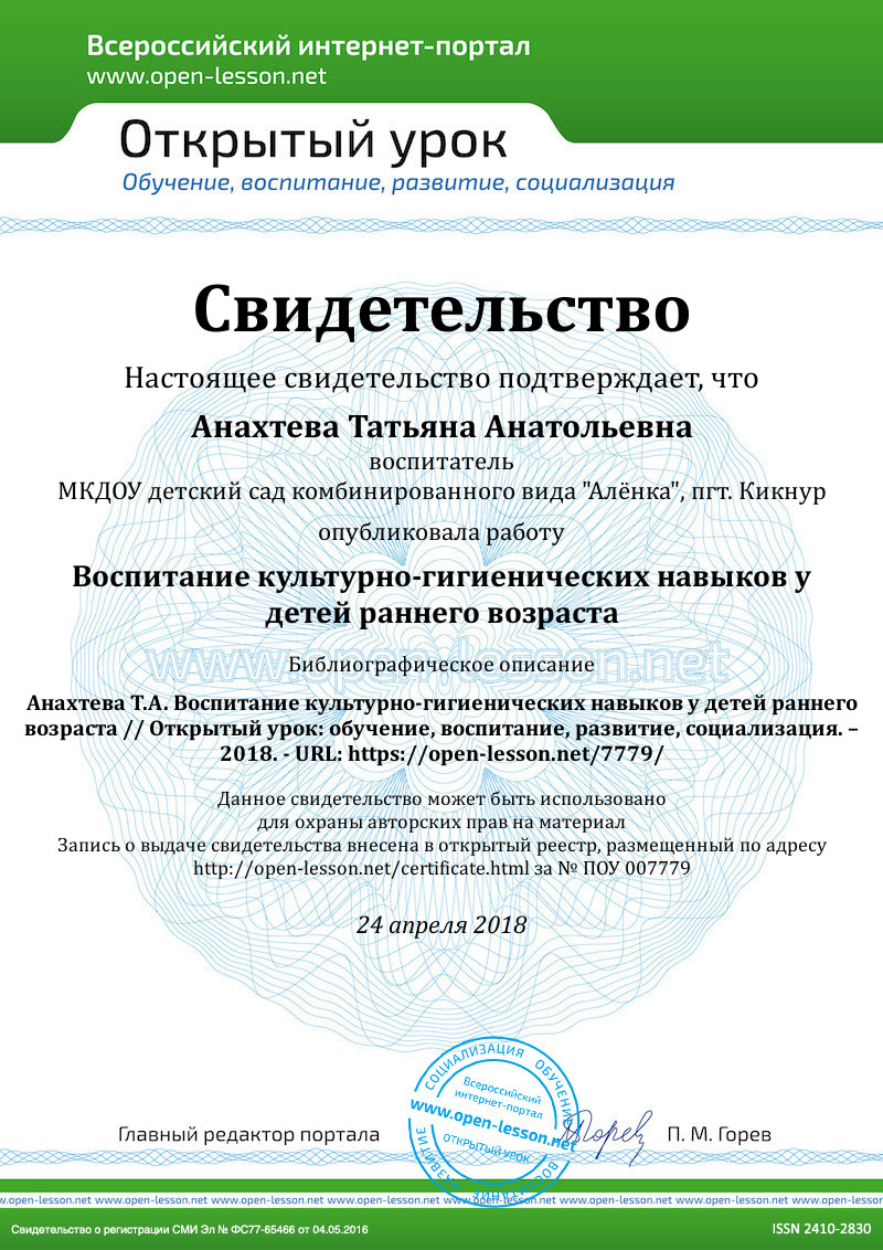 Актуальность: известно, что самые прочные привычки как полезные, так и вред-ные формируются в детстве. Вот почему так важно с самого раннего возраста воспитывать у ребенка полезные для него навыки, закреплять их, чтобы они стали привычками, так как культурно-гигиеническое воспитание – это основа культуры, необходимое условие форми-рования у детей установки на здоровый образ жизни.