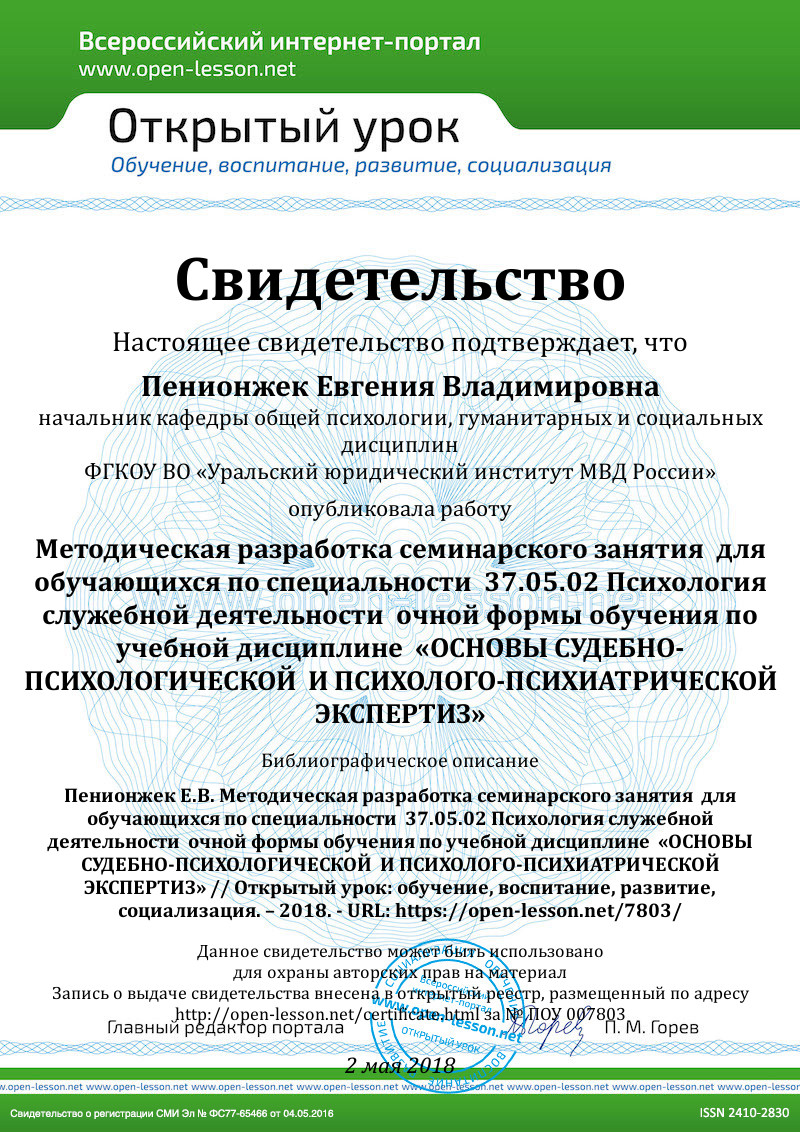 Тема следующего семинарского занятия: «Роль клинического психолога в судебно-психиатрической экспертизе».