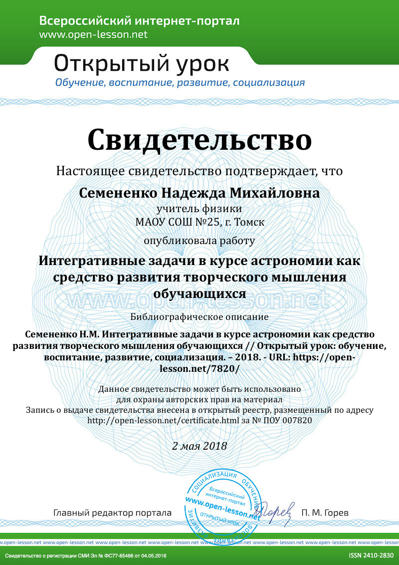 Повседневно человеку приходится на основе уже полученных знаний и опыта анализировать и решать практические проблемы в реальных жизненных ситуациях. Следовательно, одним из наиболее важных качеств современного человека является активная мыслительная деятельность, критичность мышления, поиск нового, желание и умение приобретать знания самостоятельно. В связи с новыми требованиями к личности, главной целью и результатом работы школы признается становление молодого поколения, владеющего современными не только знаниями, но и комплексом умений (компетенций), поколения развитых самостоятельных личностей. Важнейшей задачей современной системы образования является: формирование готовности к саморазвитию и непрерывному образованию; активная учебно-познавательная деятельность обучающихся; построение образовательного процесса с учётом индивидуальных возрастных, психологических и физиологических особенностей обучающихся, поэтому в рамках образовательного стандарта второго поколения. Перед школой стоит задача развития мыслительных способностей, связанных с творческой деятельностью школьников, как в коллективной, так и в индивидуальной форме обучения т.е. современному обществу требуется человек, обладающий креативным мышлением. Креативность (от англ. сreate – создавать, англ. сreative – созидательный, творческий) – творческие способности индивида, характеризующиеся готовностью к созданию принципиально новых идей, отклоняющихся от традиционных или принятых схем мышления и входящие в структуру одаренности в качестве независимого фактора, а также способность решать проблемы, возникающие внутри статичных систем. Согласно авторитетному американскому психологу Абрахаму Маслоу – это творческая направленность, врожденно свойственная всем, но теряемая большинством под воздействием среды. На, бытовом уровне креативность проявляется как смекалка – способность достигать цели, находить выход, из кажущейся безвыходной ситуации используя обстановку, предметы и обстоятельства необычным образом. Для формирования креативного потенциалаобучающихся астрономия, как учебный предмет, располагает значительными возможностями. Астрономия древнейшая из естественных наук основывается главным образом на наблюдениях, когда исследователь не имеет возможности влиять на ход физического процесса. Однако при изучении, какого-либо явления обычно имеется возможность наблюдать его на многих небесных объектах при различных условиях. Успешное освоение астрономии возможно только при условии реализации межпредметных связей, астрономия связана с физикой, математикой, географией, историей, экологией, химией, ОБЖ, экономикой, языкознанием и литературой. Одним из возможных путей решения этой проблемы является использование в методике преподавания астрономии задач интегративного содержания.