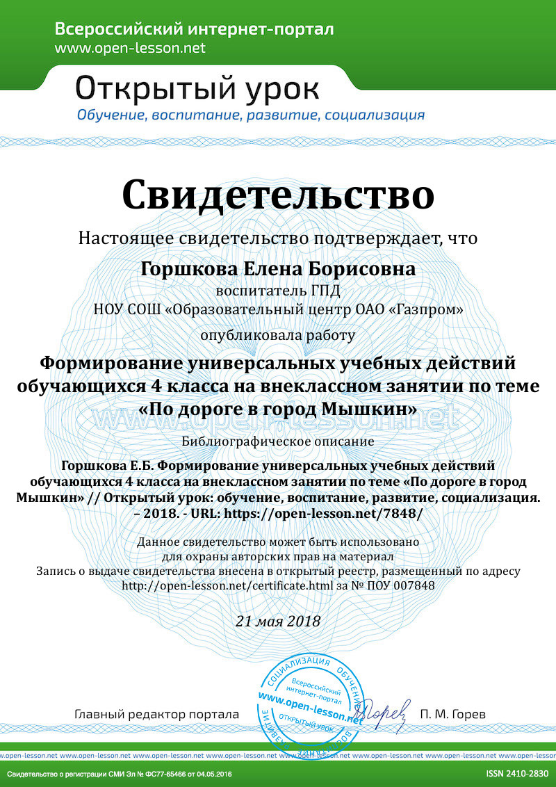 Каждый учебный год в ОЧУ «Газпром школа» выбирается приоритетное направление воспитательной работы, выбирается ключевое слово, которое отражается во внеурочной деятельности. «Успешность», «Здоровье», «Культура» и «Спорт» – это ключевые слова прошлых лет. «Наука» – ключевое слово 2017–2018 учебного года. Выбор его не случаен. Научные знания помогают людям рационально организовывать свою деятельность и решать различные проблемы, возникающие в её процессе. Поэтому очень важно сформировать научное мировоззрение, а самое удачное время для этого – школьные годы. Внеклассное занятие «По дороге в город Мышкин» – это воспитательное мероприятие, направленное на применение знаний и получение школьниками опыта переживания и позитивного отношения к базовым ценностям общества (человек, семья, Отечество, природа, мир, знания, труд, культура). В приложении к конспекту отражены задания, направленные на формирование универсальных учебных действий на внеклассном занятии в группе продленного дня.