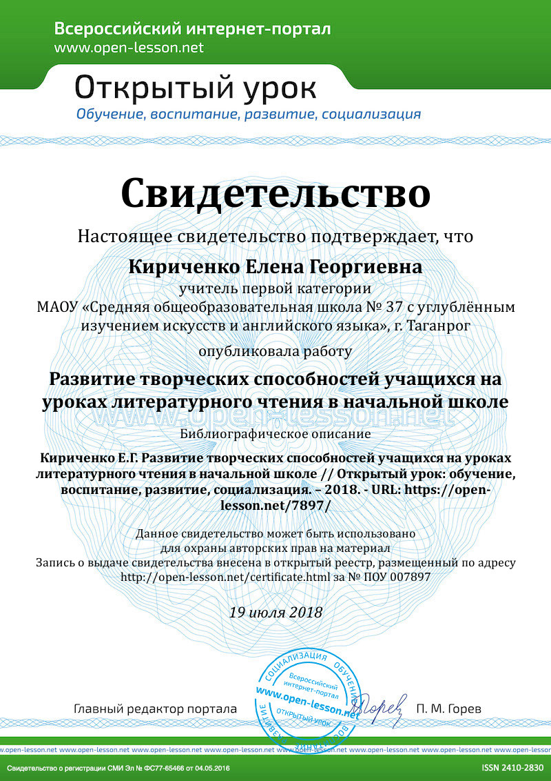 В Концепции модернизации российского образования до 2010 г. одной из первостепенных выдвинута задача достижения нового, современного качества образования, выражающегося в необходимости развития творческих созидательных способностей личности. Соответственно знания и умения являются не конечной целью обучения, а инструментом, средством, полем для творческой деятельности, для самореализации каждого человека. Особого внимания требует обращение к данной проблеме в начальной школе, поскольку именно в младшем школьном возрасте закладываются основы учебной и осознанно управляемой творческой деятельностей.