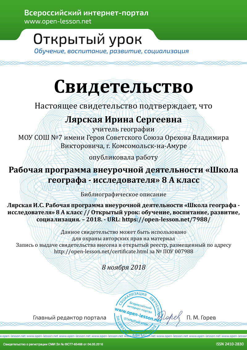Внеурочная деятельность способствует улучшению учебной мотивации и развитию познавательных интересов учащихся. Соединение практической и интеллектуальной деятельности способствует умственному развитию учащихся, является средством укрепления здоровья и рационального использования свободного времени, воспитывает культуру интеллектуального труда. У ребят формируется потребность применять знания в повседневной жизни. Поэтому программа внеурочной деятельности «Школа географа - исследователя» для 8-х классов общеобразовательного учреждения, разработана учителями: Лярской Ириной Сергеевной (ВКК) в соответствии с: