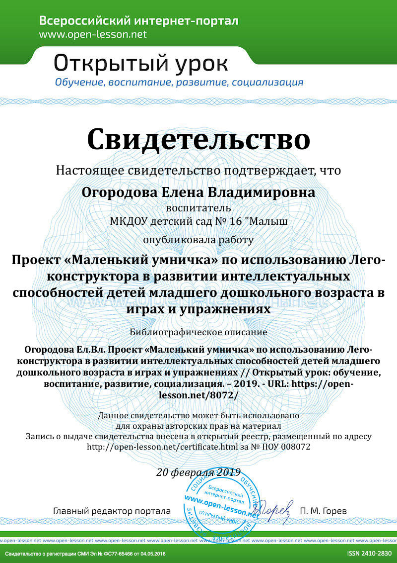 2. Низамова Юлия Сергеевна, воспитатель, Проект по развитию интеллектуальных способностей детей дошкольного возраста посредством игровой деятельности на примере конструктора LEGO.