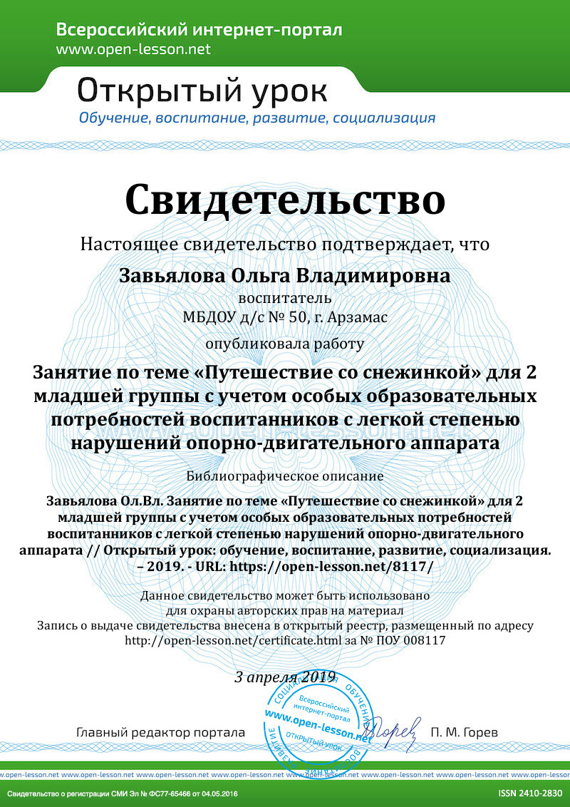 В связи с тем, что организованная образовательная деятельность по теме «Путешествие со снежинкой» для детей младшего дошкольного возраста, в состав которой входит 1 ребёнок с лёгкой степенью нарушений опорно-двигательного аппарата, проходит в игровой форме, занятие не имеет существенных отличий от проведения обычной организованной образовательной деятельности. Для снятия усталости проводятся игра малой подвижности «Зашагали ножки» и подвижная игра «Зайка беленький сидит», которые учитывают специфику здоровья ребёнка с лёгкой степенью НОДА.