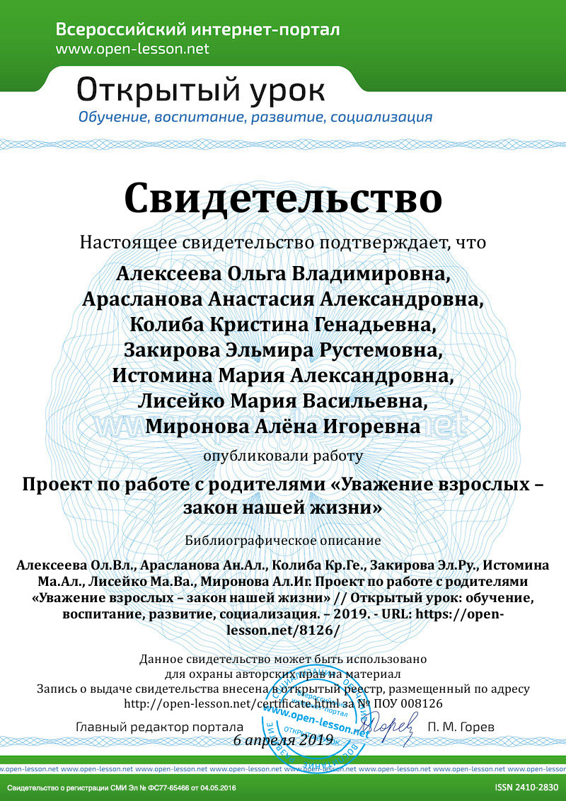 1. Название проекта: «Уважение взрослых – закон нашей жизни»