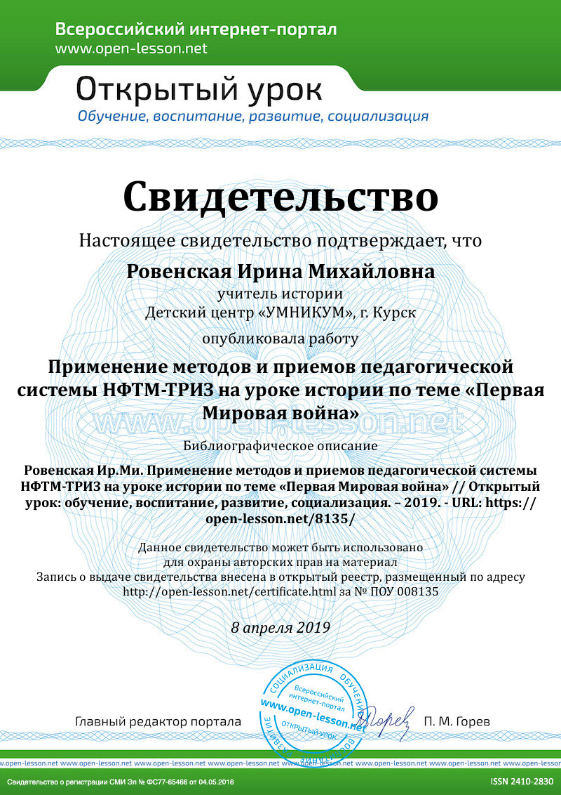 В статье описан пример урока истории на основе системы НФТМ-ТРИЗ.
