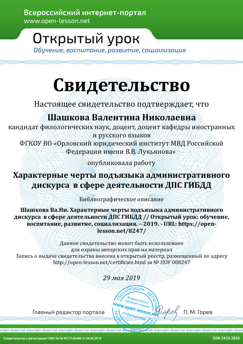 Характеризуя подъязык текстов, формирующих в своей совокупности профессиональный язык сотрудника ДПС ГИБДД, следует отметить нейтральную стилистическую окраску лексики, конкретную референцию имён и перфективных (предельных) глаголов, что позволяет нам квалифицировать используемый коммуникативный регистр как репродуктивно-повествовательный (термин Г.А. Золотовой) [7, с. 26-35].