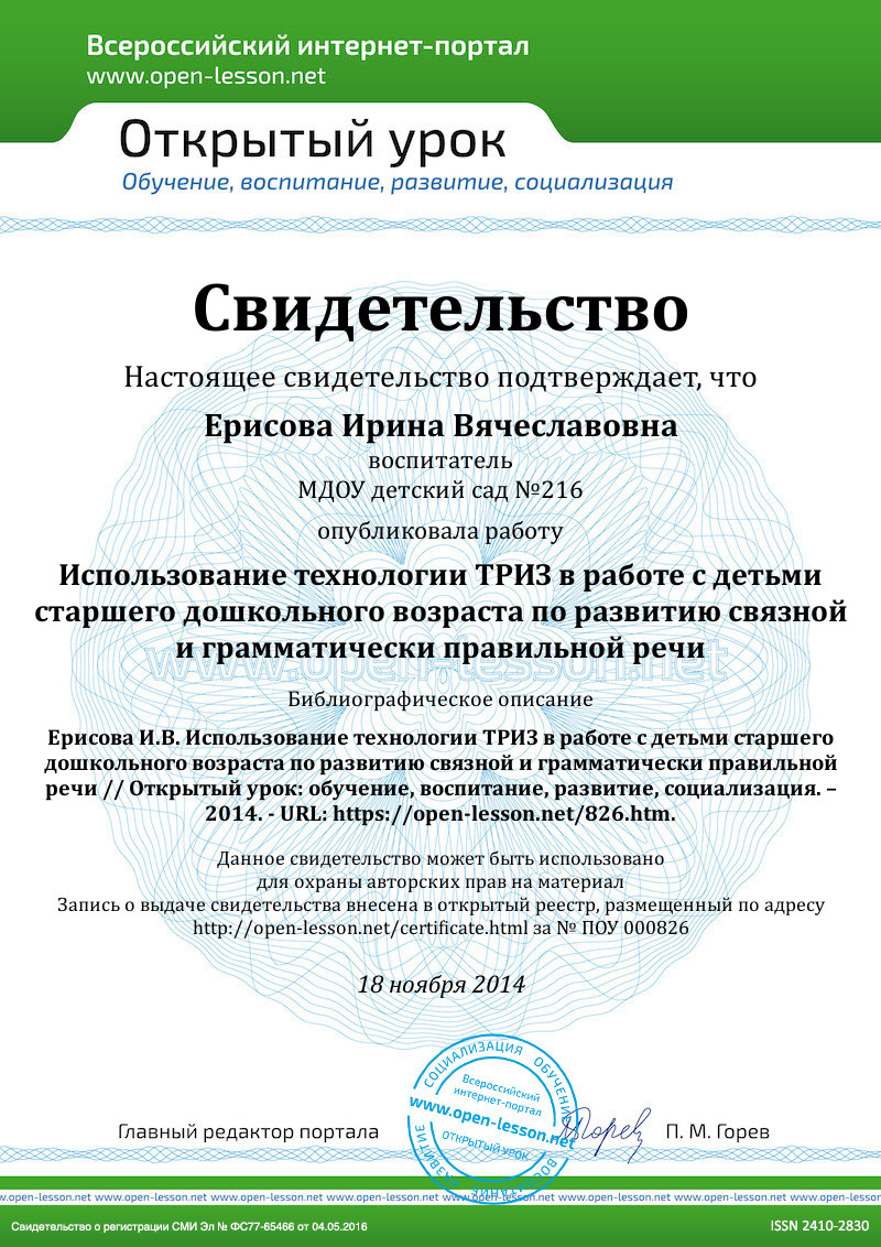 - Серегина О. В. Формирование навыков связной речи у детей дошкольного возраста в процессе использования приёмов ТРИЗ-технологий. / Научная статья. Журнал «Вестник Томского государственного педагогического университета», №5, 2012.