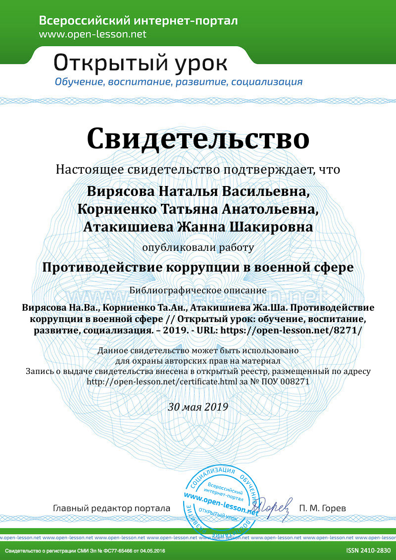 - Хачикян П.П. Противодействие коррупции в Вооруженных силах Российской Федерации/ П.П. Хачикян.- М.: Москва, 2017.- 23 с.