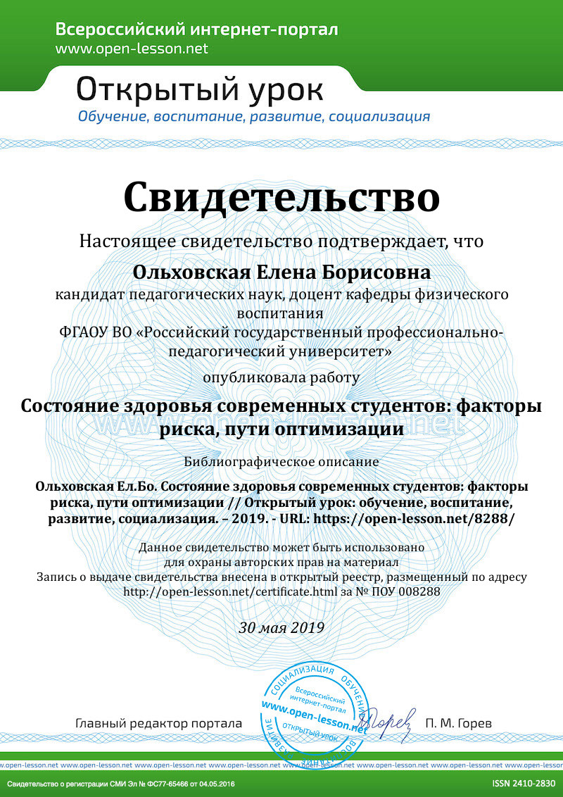 - Ольховская Е.Б. Оптимизация психофизического здоровья студентов средствами физкультурно-спортивной деятельности // Современные научные исследования и разработки. – 2016. - № 6 (6). – С. 409-411.