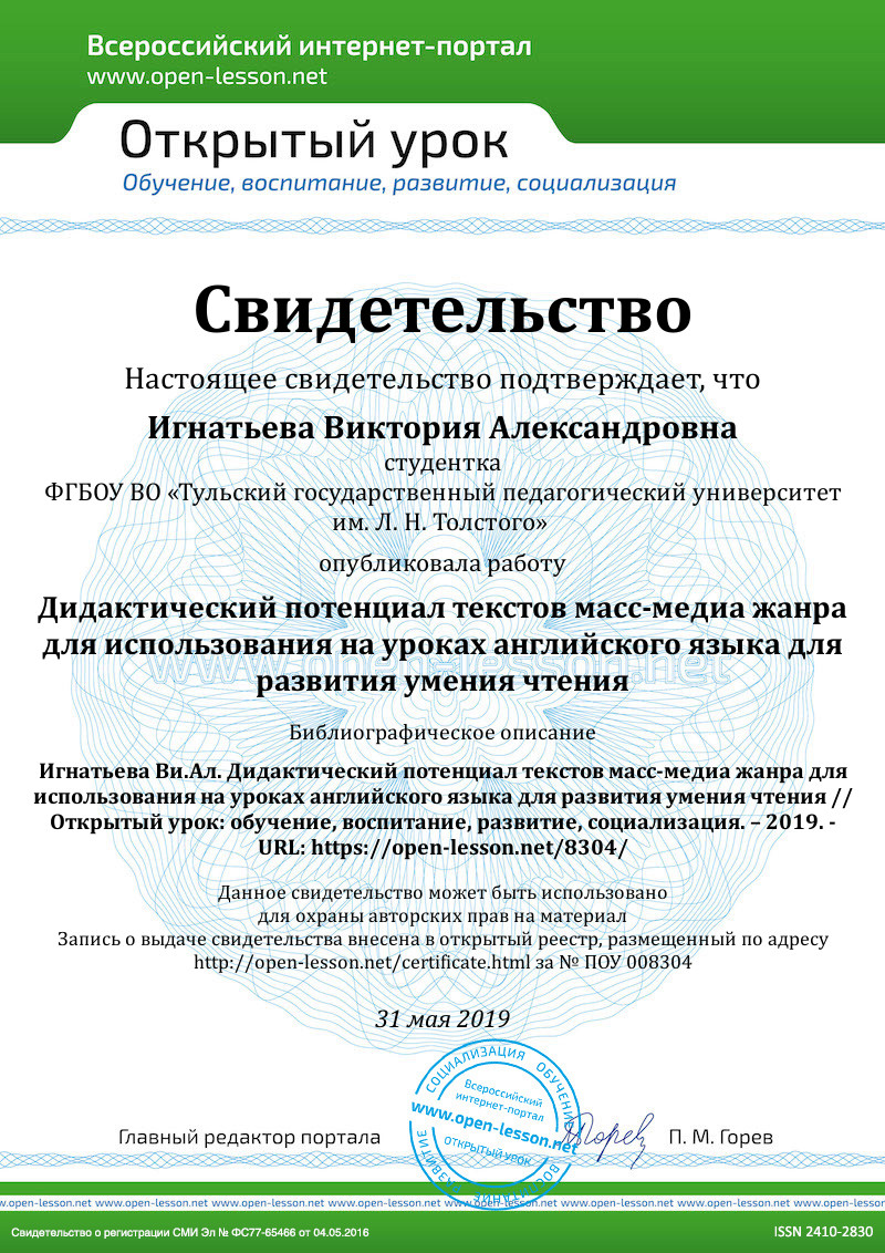 Цель современного иноязычного образования – формирования иноязычной коммуникативной компетенции, которая может быть реализована через использование аутентичных текстов в качестве учебных вспомогательных материалов. Медийные тексты могут послужить видом аутентичных материалов, так как они содержат в себе информацию о жизни других народов, их культуре и языке. Таким образом, нельзя не отметить ценность публикаций средств массовой информации для обучения английскому языку в контексте расширения межкультурных контактов, так как они помогают учителю удовлетворить различные потребности и интересы своих учеников, предоставляют учащимся материал для интегрированного развития речевых умений чтения, письма, говорения и аудирования, а также языковых лексико-грамматических навыков. Тексты масс-медиа жанра мотивируют учащихся к изучению языка благодаря своей актуальности и новизне и поощряют чтение англоязычных текстов в целом, как внутри, так и вне класса, способствуя продолжению языкового образования за пределами класса.