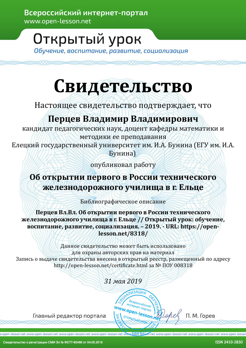 У ельчан есть веское основание для гордости, ведь Елецкое железнодорожное училище им. Александра II было первым учебным заведением в России, готовившее специалистов для железной дороги, послужившее в последствии образцом для других училищ подобного рода. Год основания этого учебного заведения в разных источниках называется разным. В энциклопедическом словаре Брокгауза и Ефрона - самом авторитетном дореволюционном издании в разных статьях приводятся различные даты. Например, дореволюционный исследователь образования А.С. Таненбаум в статье «Железнодорожные училища» отмечает: «Первое учебное заведение для подготовления низших техников железнодорожной службы было учреждено в 1869 г., на средства строителя железных дорог Полякова, в городе Ельце» [4]. В статье «Поляков Самуил Соломонович» того же издания годом учреждения значится 1867 г. Елецкий краевед Г.Е. Макарова отмечает, что учреждено училище было в 1869 г., а открылось же в новом здании в 1871 г [5, c. 68].