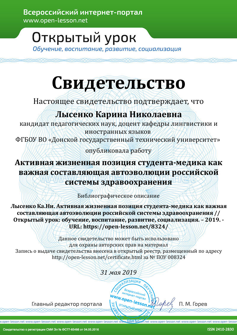 - Шаповал Г.Н. Поддержание высокого уровня мотивации обучения в ходе социализации личности иностранного студента медицинского вуза // Гуманитарные и социально-экономические науки. 2015. № 1 (80). С. 81–84.