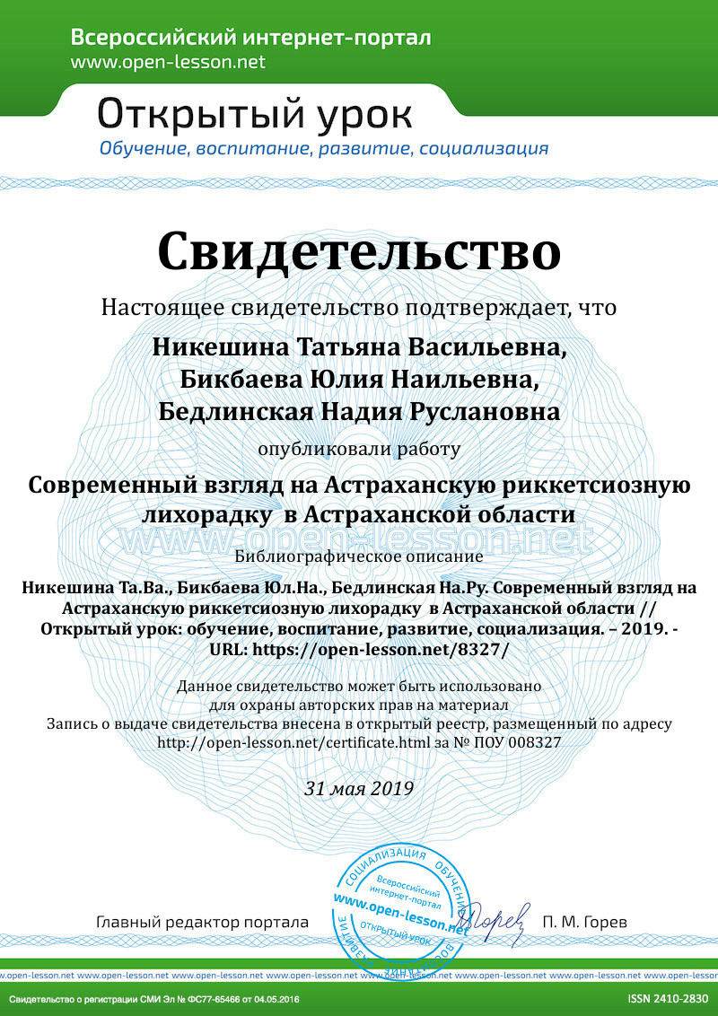 - Бедлинская Н.Р. Клиническое течение Астраханской риккетсиозной лихорадки в зависимости от наличия тромбогеморрагического синдрома/ Галимзянов Х.М., Лазарева Е.Н., Мирекина Е.В., Кантемирова Б.И., Горева О.Н. //Инфекционные болезни. 2016. Т. 14. № S1. С. 31.