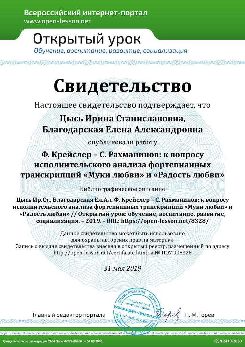 Таковыми являются и переложения Рахманинова вальсов «Муки любви» и «Радость любви», представляющие собой ярко индивидуальный перевод скрипичных миниатюр Крейслера на язык рахманиновского пианизма со всеми особенностями гармонического, ритмического, полифонического изложения. В работах о Рахманинове обращаются, прежде всего, к крупным сочинениям, таким как концерты для фортепиано с оркестром, Прелюдии ор. 32, Этюды-картины ор. 23, Музыкальные моменты, Симфонические танцы [2]. Одиннадцать транскрипций, среди которых, помимо крейслеровских вальсов, «Маргаритки», «Сирень», Скерцо из музыки к пьесе Шекспира «Сон в летнюю ночь», «Полет шмеля», остаются малоизученными сочинениями великого мастера.