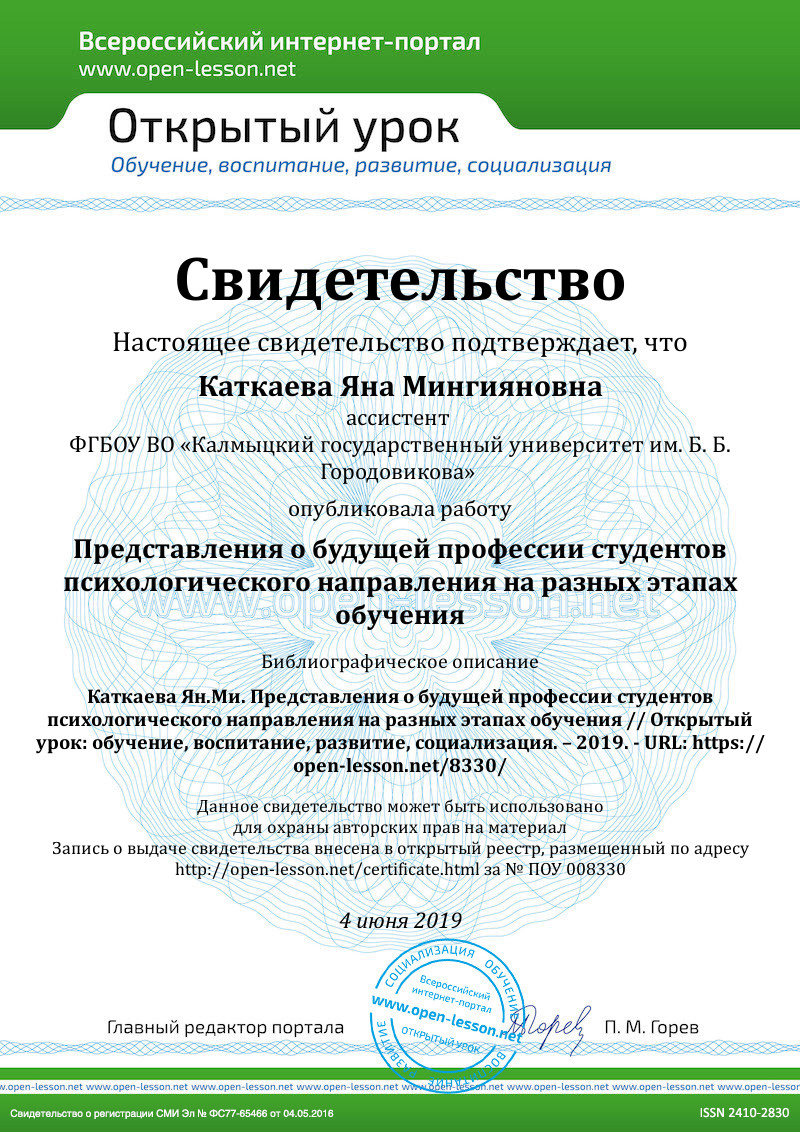 Таким образом, можно заключить, что представления о будущей профессии психолога у студентов кафедры психологии КалмГУ им. Б. Б. Городовикова разные в зависимости от этапа обучения: с накоплением знаний и практических навыков в вузе представления о будущей профессии у студентов приобретают более дифференцированный характер; с каждым курсом студенты более отчетливо понимают характер психологической деятельности, что означает формирование у студентов собственных ориентиров в профессии и плодотворное протекание процесса развития будущих психологов как профессионалов в своем деле.
