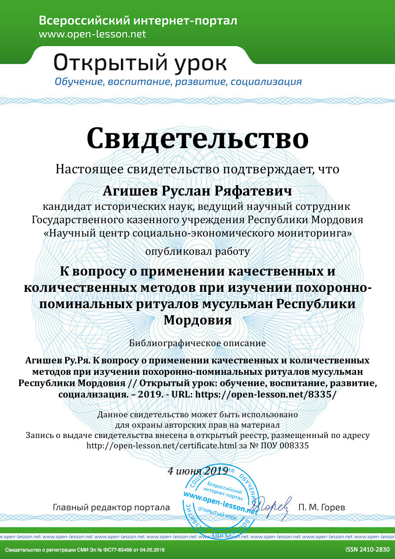 Биографический метод. Использование биографического метода для изучения особенностей похоронно-погребальных практик мусульман в Республике Мордовия обусловлено следующим важным обстоятельством. В республике, как и в ряде других регионах с компактным проживанием татар-мусульман, в первые годы советской власти были ликвидированы мусульманские религиозные образовательные учреждения и, как правило, репрессированы носители профессиональных религиозных знаний — муллы. В частности, И. Р. Миннуллин отмечает, что в 70 — 80-е гг. XX в. «в республике осталось лишь одно татарское село, где на протяжении всего советского периода сохранялась преемственность передачи религиозных знаний от людей, имеющих религиозное образование» [9, 137].