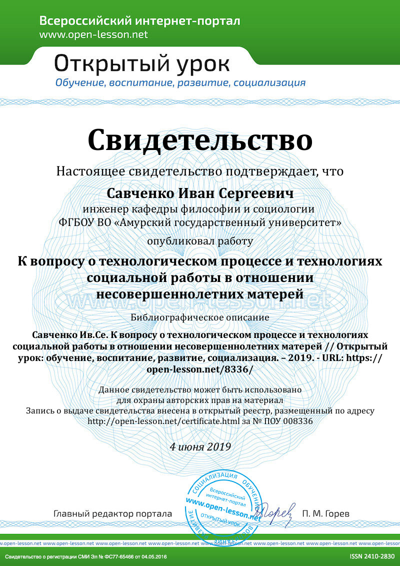 - Савченко, И.С. Технологии социально-психологической работы с несовершеннолетними матерями в Амурской области / И.С. Савченко // Материалы III Международной научно-практической конференции «Технологии социальной работы в различных сферах жизнедеятельности» 2017. – с. 215–219.