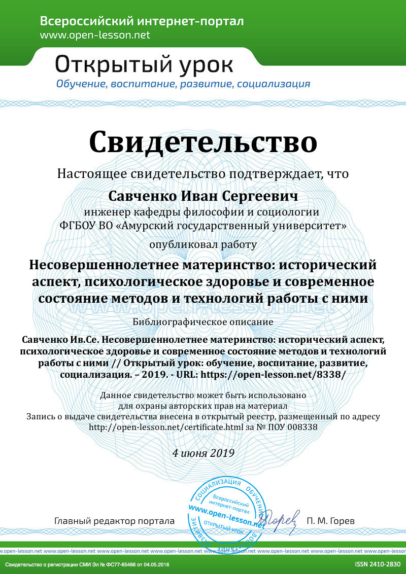 Но говоря об исторических парадигмах, диктуемых как субъективными, так и объективными причинами, нельзя не рассмотреть современное положение дел, касающееся несовершеннолетнего материнства в XXI веке. Также интересным представляется соотношение психологического здоровья несовершеннолетних матерей в связи с появлением нового для них социального статуса. Данным вопросам будет посвящена вторая часть представленной статьи.