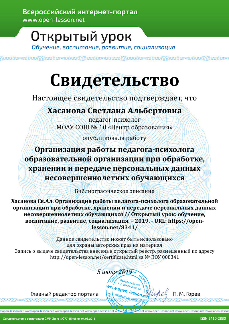 В перечне нормативно-правовых актов, регулирующих профессиональную деятельность педагога-психолога образовательной организации при обработке, хранении и передаче персональных данных, можно выделить Федеральный Закон от 27.07.2006 г. № 152-ФЗ «О защите персональных данных», Федеральный закон от 27.07.2016 г. № 149-ФЗ «Об информации, информационных технологиях и о защите информации».