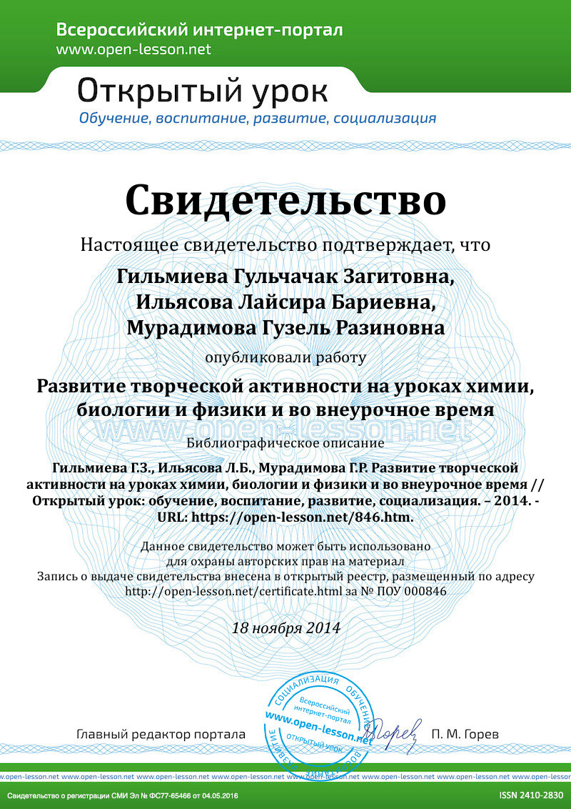chemistry and biology teacher of the highest qualification category , MAEI «Gymnasium № 77» Naberezhnye Chelny, Republic of Tatarstan