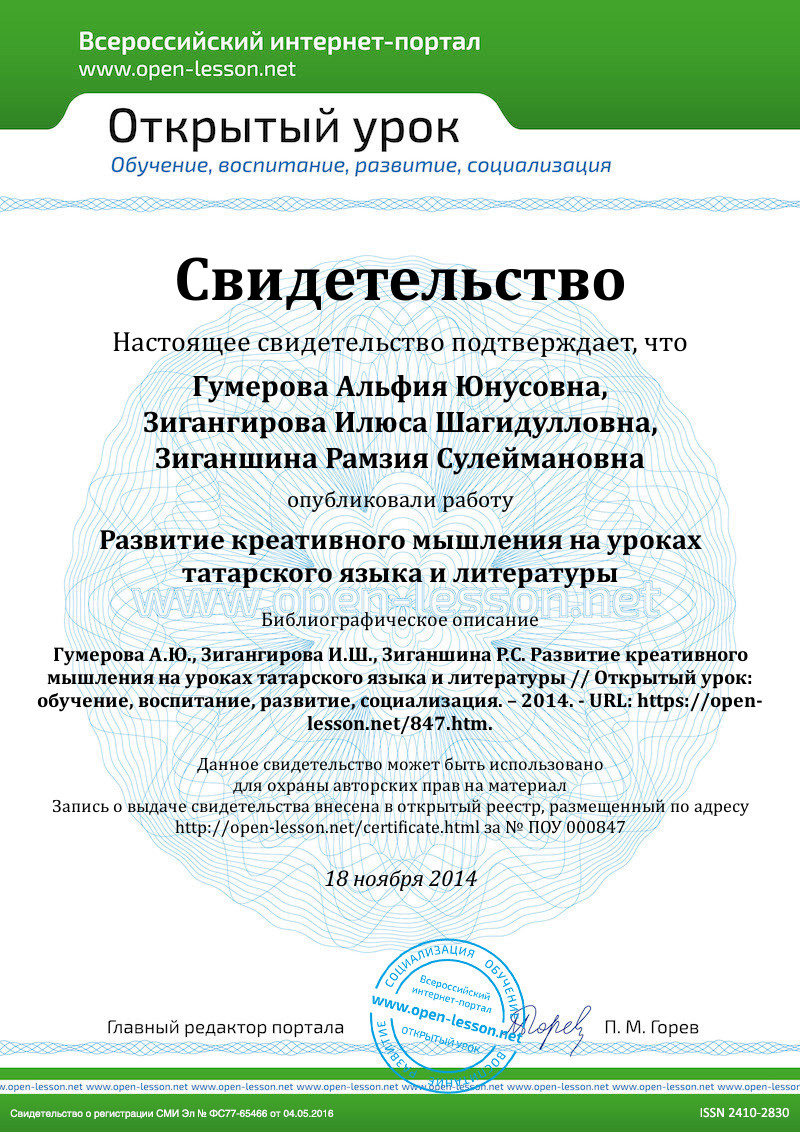 В педагогике XXI века в центре стоит личность ученика, которая и является целью образования. Поэтому педагогический процесс имеет ориентацию на воспитание свободной, развитой и образованной личности, владеющей комплексом необходимых компетенций. Одна из компетенций – речевая (коммуникативная), т.е. способность использовать накопленный языковой материал в речи с целью общения. На уроках татарского языка и литературы эта компетенция формируется в первую очередь. Как правило, любой урок, если он минует состояние творческой сосредоточенности и порыва, если на нем нет ни капли ошеломления и удивления, оказывается безликим, ненужным, однодневным, даже когда информация, полученная на нем, весьма полезна. Вот почему помочь ученику найти себя, заявить о себе, научить детей верить в себя, отказаться от однобокости оценок, увидеть в каждом хорошее, дать каждому шанс, одним словом, создать на уроке условия для «встречи ребенка со своими возможностями, со своими способностями» (Л. С. Выготский), создать ситуацию успеха, сотрудничества и сотворчества – вот те задачи, которые я ставлю перед собой, создавая сценарии уроков на основе уже известных, традиционных и инновационных, методов преподавания и собственных творческих наработок.