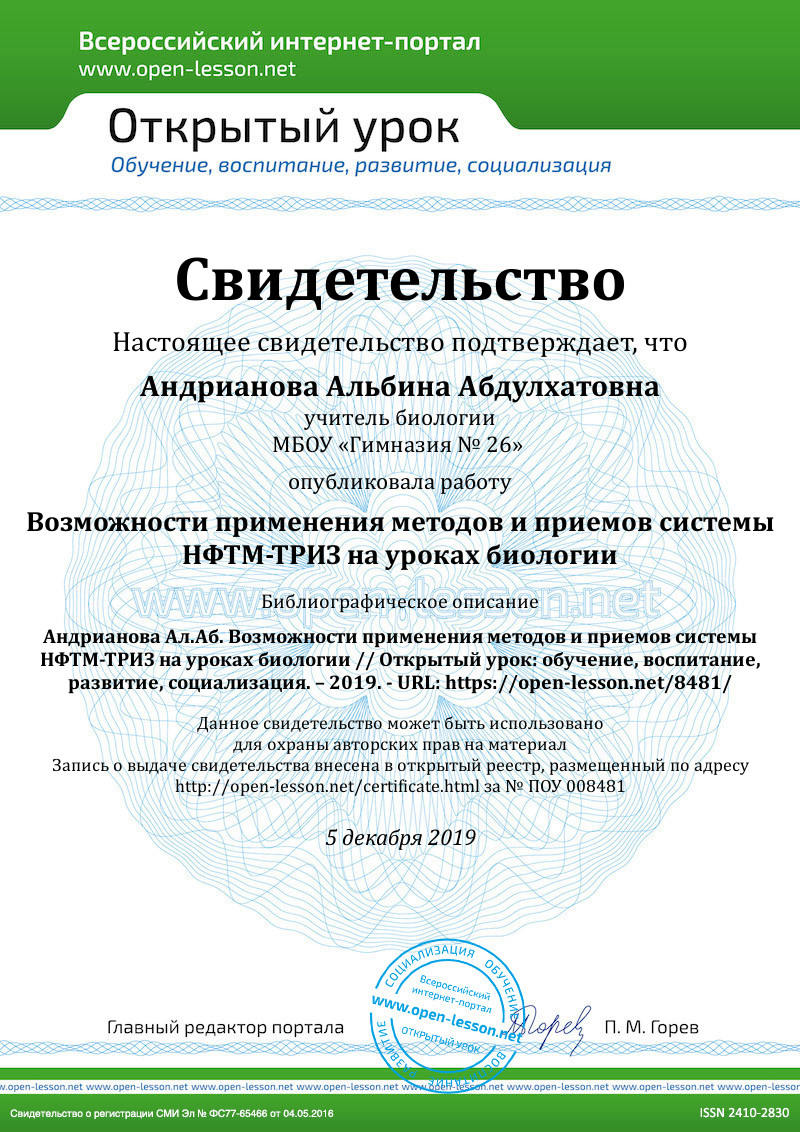 Думаю, не вызовет сомнений мысль о том, что биология одна из тех наук, которая предполагает развитие интеллектуальных и творческих способностей учащихся — это происходит в процессе наблюдений, экспериментов, самостоятельной работы с различными источниками информации. На уроке биологии учащиеся получают большой «багаж знаний» (объем информации, который требуется применить при выполнении заданий ГИА), а также набор приемов для решения стандартных задач сборников ЕГЭ и ГИА. Эти знания и умения являются фундаментом для дальнейшего развития выпускника школы, поступающего в медицинский ВУЗ, но нельзя недооценивать и тот факт, что любой другой творческий человек, не знающий, как устроен его организм, не умеющий увидеть необычное в обычном дереве или птичке, сидящей на ветке этого дерева, не умеющий грамотно изложить свои мысли вряд ли много добьется в современной жизни. Вместе с тем практика показывает, что в реальной жизни человеку приходится решать совсем другие – открытые – задачи, где нет достаточных условий для решения проблемы, неизвестно, с какой стороны к ней подступиться, да и сама проблема порой скрыта за массой второстепенных деталей. Работая не первый год в школе учителем биологии приходится констатировать, что в учебниках по биологии не так много открытых задач, практико-ориентированных, с которыми можно бы было организовать плодотворную работу на уроке. Решение подобных задач предполагает, что ребенок самостоятельно определит цель, интуитивно найдет способы достижения цели и раздобудет необходимую информацию известными ему способами. Возникает необходимость целенаправленного формирования творческого мышления учащихся – если мы действительно хотим подготовить их к реальной жизни, а не только к «успешной сдаче экзаменов». ТРИЗ-технология – это технология решения изобретательских задач (основатель Г. С. Альтшуллер). Основная цель этой технологии научить детей мыслить системно, с пониманием того, что происходить и как происходит. В основу ТРИЗ-технологии положено решение противоречий или ситуаций требующих, найти выход из создавшегося положения. Решение задач такого типа невозможно без использования творческого подхода. Творчество предполагает креативность мышления, нестандартный подход в выборе решения [1].