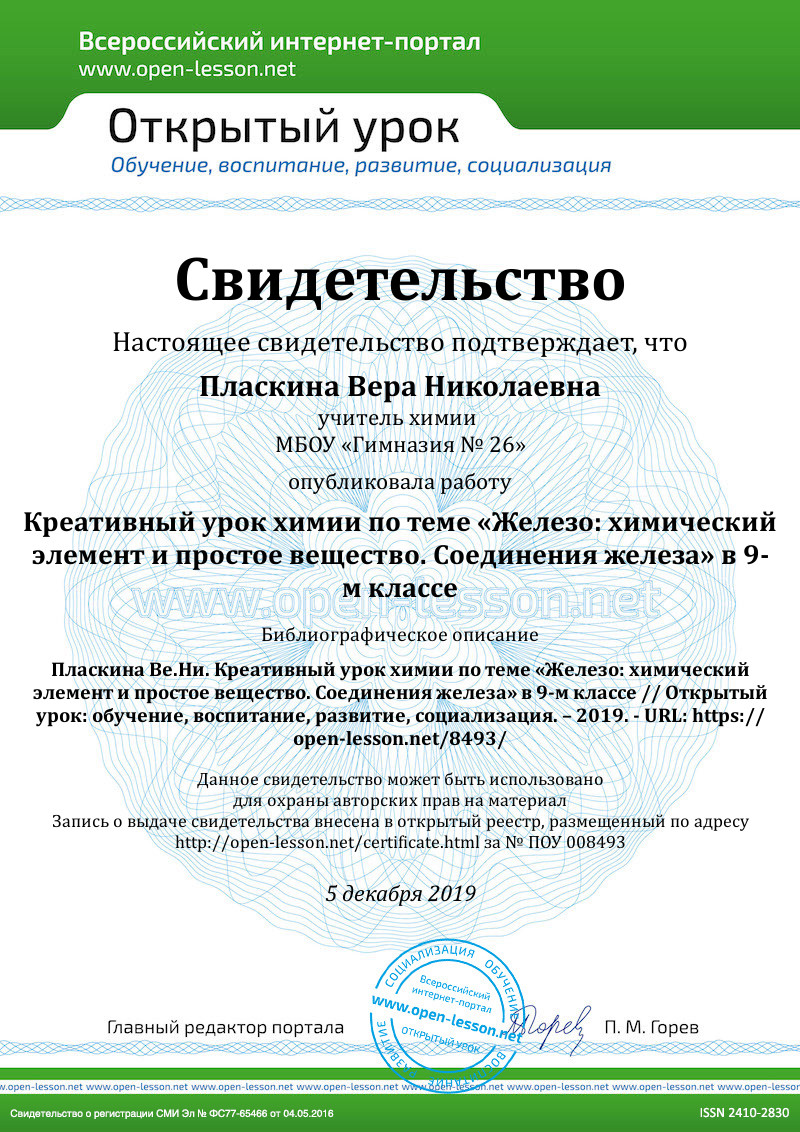 – Какими особыми свойствами обладает железо? (серебристо-белый металл, обладает большой ковкостью и пластичностью, сильными магнитными свойствами, имеет плотность 7,87 г/см3, tпл=1539°С).