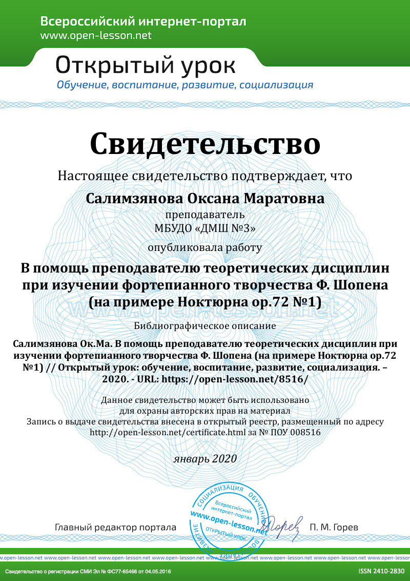 Сочетая романтические идеи, образы с классическими нормами, Шопен часто использует традиционные формы. Многие его ноктюрны написаны в простой трехчастной форме. Но встречаются и случаи, в которых замысел произведения воплощается менее типичным для данного жанра образом. Наше внимание привлек ноктюрн Шопена ор. 72 №1 e-moll, опубликованный после смерти композитора. Целью работы является анализ структуры и гармонических средств, на основании которого можно будет сделать соответствующие выводы об особенностях музыкальной формы произведения. Особенности формообразования могут представлять большой интерес для детей, обучающихся по предпрофессиональной программе