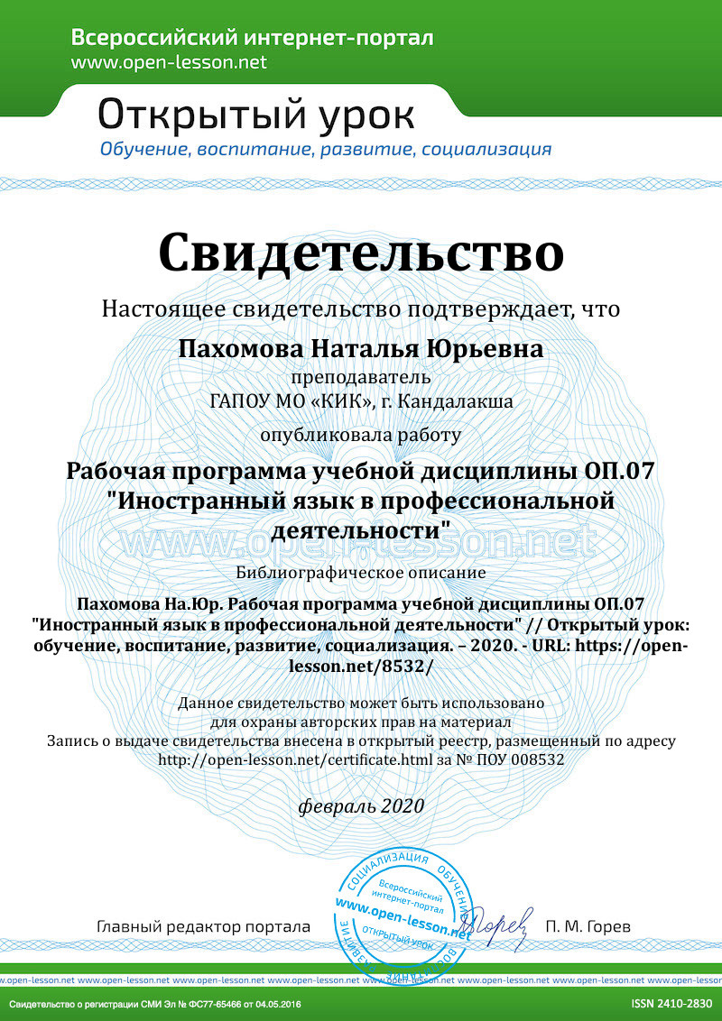Рабочая программа учебной дисциплины ОП.07 «Иностранный язык в профессиональной деятельности» (Английский) является частью основной профессиональной образовательной программы в соответствии с ФГОС по профессии СПО. Программа разработана на основе требований ФГОС среднего общего образования, предъявляемых к структуре, содержанию и результатам освоения учебной дисциплины «Иностранный язык», в соответствии с Рекомендациями по организации получения среднего общего образования в пределах освоения образовательных программ среднего профессионального образования на базе основного общего образования с учетом требований федеральных государственных образовательных стандартов и получаемой профессии среднего профессионального образования (письмо Департамента государственной политики в сфере подготовки рабочих кадров и ДПО Минобрнауки России от 17.03.2015 № 06-259).
