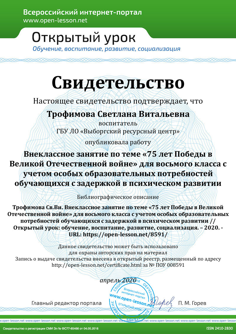 Проведение инклюзивного занятия по теме «75 лет Победы в Великой Отечественной войне»» для обучающихся 8 класса, в состав которого входит 3 ребёнка с задержкой психического развития, имеет незначительные отличия от проведения обычного урока. В ходе занятия таким ученикам оказывается дополнительная помощь в освоении материала, задаются наводящие вопросы, дается больше времени на выполнение заданий. Так же некоторые задания носят упрощенный характер. Материал данного урока носит познавательный характер, объясняет ученикам, почему так важно помнить и чтить День победы, как нелегко было приблизить этот день и сколько пострадало людей.