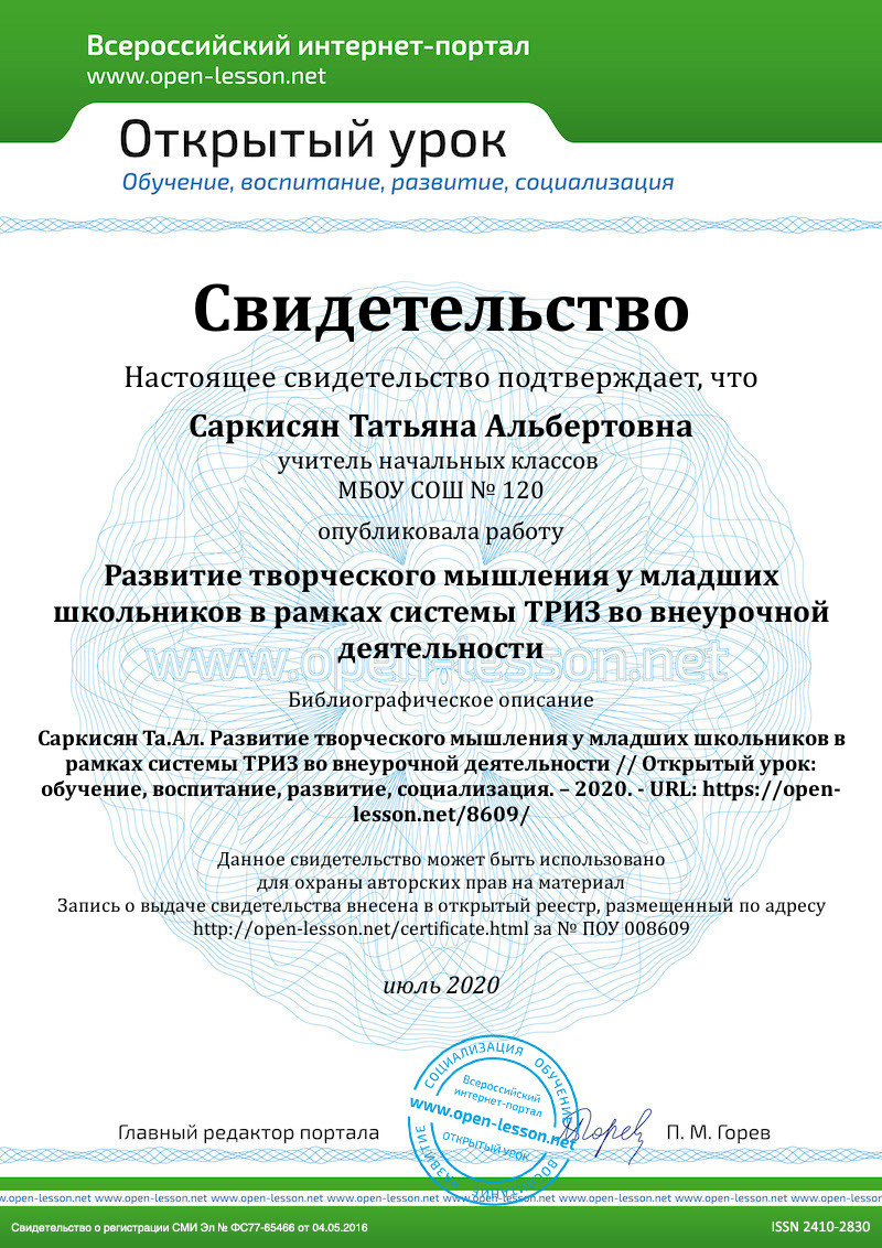 Развитие творческого мышления у младших школьников в рамках системы ТРИЗ во внеурочной деятельности