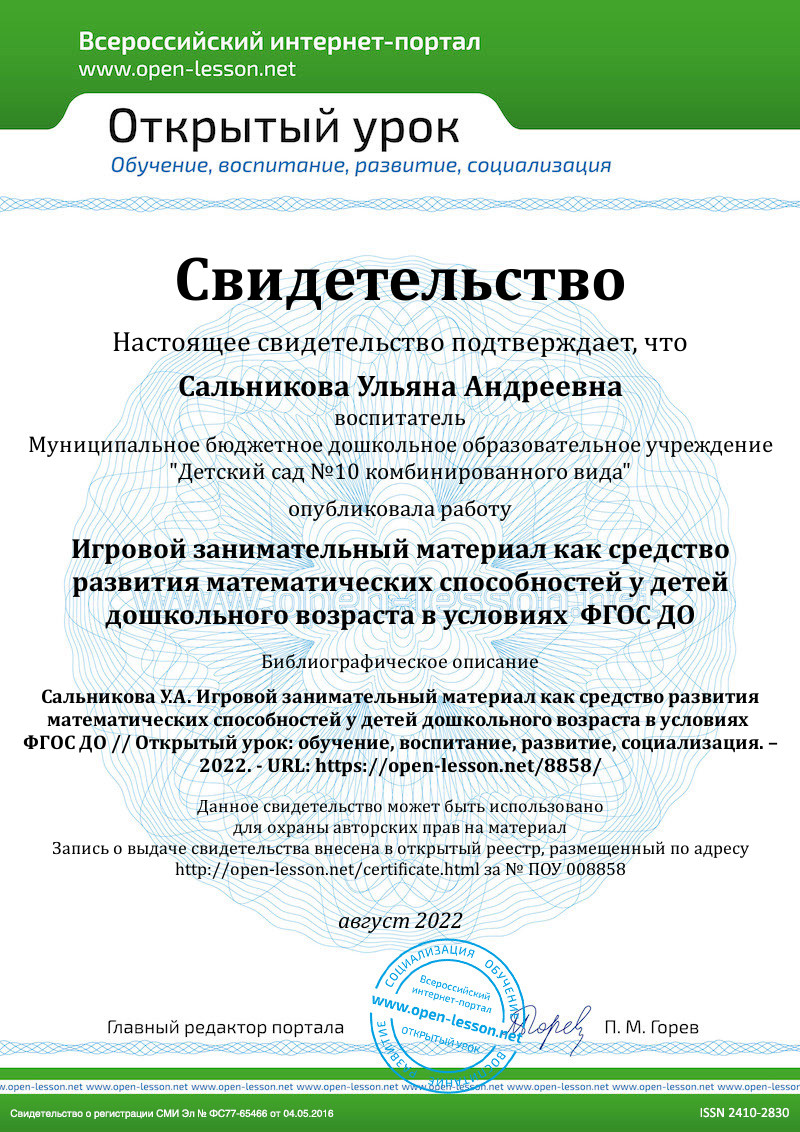 В заключение необходимо отметить, что регулярное использование на занятиях по математике системы специальных игровых задач и заданий, направленных на развитие познавательных возможностей и способностей, расширяет математический кругозор дошкольников, способствует математическому развитию, повышает качество математической подготовленности, позволяет детям более уверенно ориентироваться в простейших закономерностях окружающей их действительности и активнее использовать математические знания в повседневной жизни.