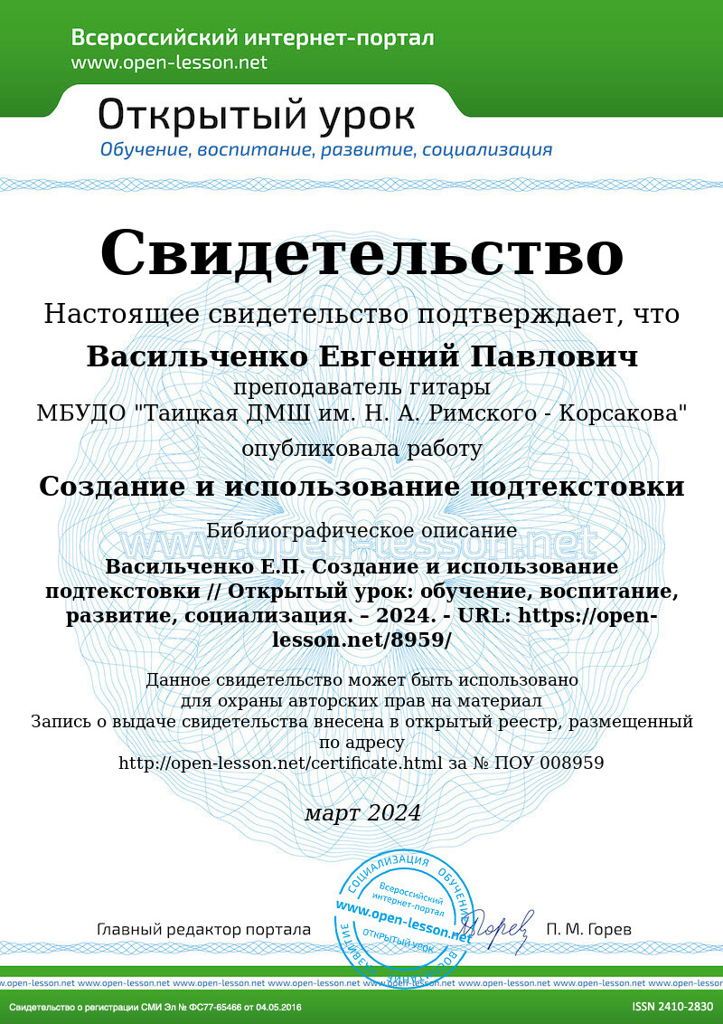 Создаваемый вспомогательный текст может представлять собой цельное стихотворение, это целесообразнее всего в небольших пьесах, используемых в первые годы обучения с маленькими учениками. В дальнейшем, со старшими ребятами достаточно прорабатывать таким образом фрагменты, имеющие решающий драматургический смысл, или представляющие техническую трудность, либо трудны к запоминанию. Написание подтекстовки требует от педагога внимания к психологическим особенностям детей в целом и конкретного ученика в частности.