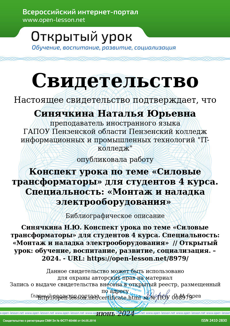 Конспект урока по теме «Силовые трансформаторы» для студентов 4 курса