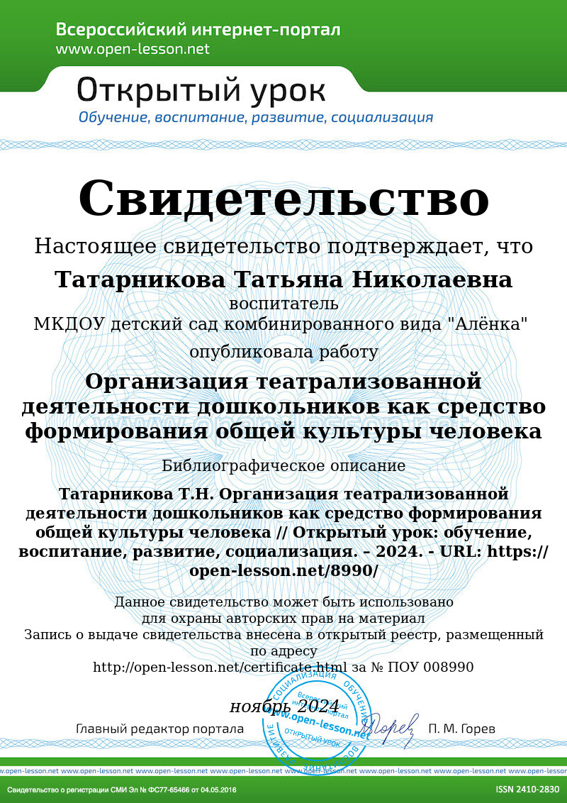 - Сорокина Н. Ф.– Театрализованные игры в детском саду // Дошкольное воспитание. – 1997. - №6. – С. 59-62.