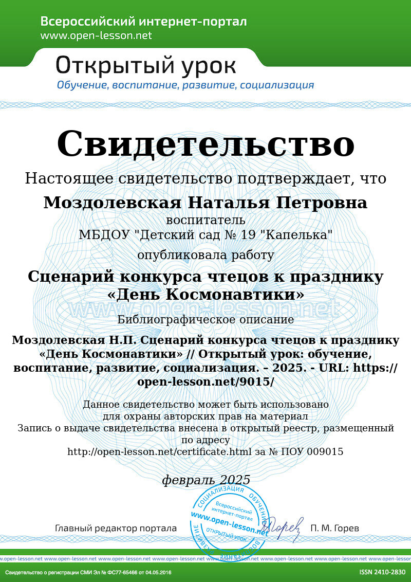 Здравствуйте, дорогие дети! Здравствуйте, уважаемые взрослые! Дети, вы знаете, что 12 апреля вся наша большая страна отмечает День Космонавтики. Мы с вами поговорим о том, как люди осваивали космическое пространство и почему именно 12 апреля считается Днём космонавтики. Сегодня у нас – конкурс чтецов, посвящённый этому торжественному празднику. Вы, ребята, будете читать стихи громко, с выражением, и еще узнаем много интересного. Давайте начнём наш конкурс!
