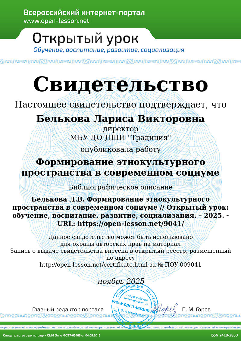 Аннотация: в статье исследуются проблемы комплектования, изучения,сохранения и пропаганды духовного (нематериального) наследия. Предлагается основанная на многолетнем опыте работы с детьми и подростками модель этнокультурного образования в Муниципальном бюджетном учреждении дополнительного образования «Детская школа искусств «Традиция» с. Власиха г. Барнаула